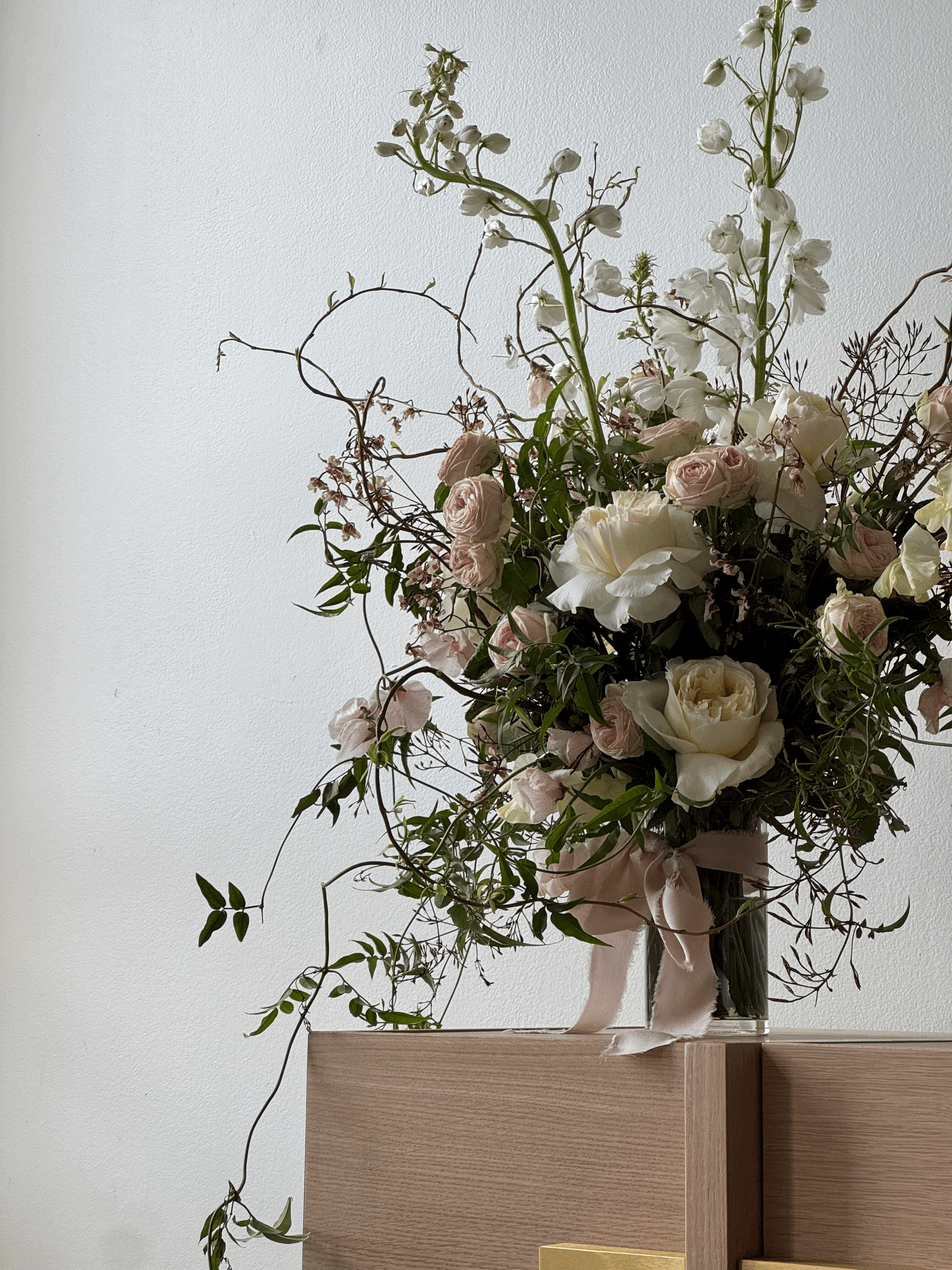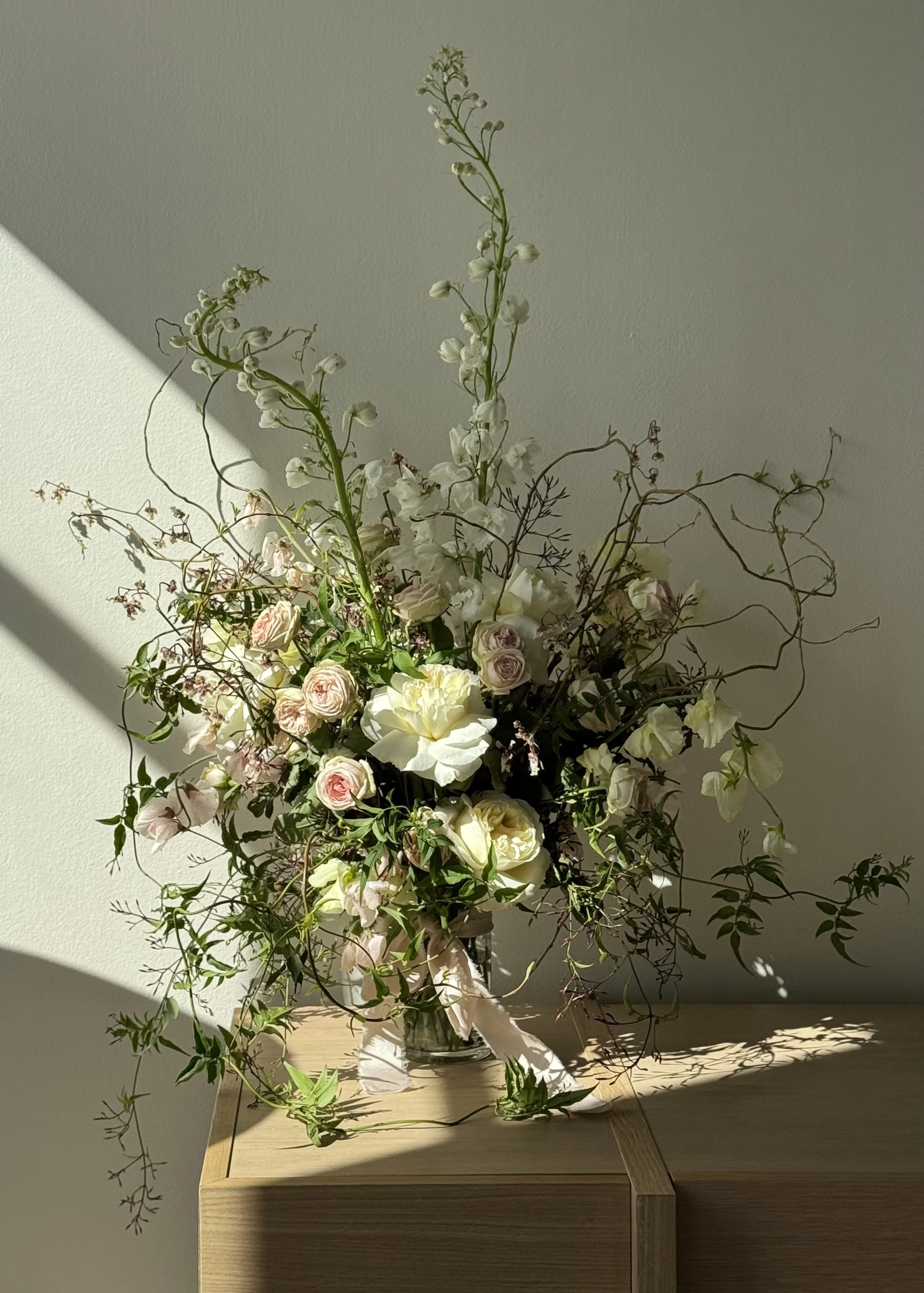 Bring the beauty of a wild, romantic garden indoors this Valentine’s Day with our "Garden" arrangement. Crafted with exquisite garden roses, elegant Delphinium, delicate sweetpeas, imported Japanese Oncidiums, and wild budding curly willow branches, this piece radiates natural sophistication. With its high-quality blooms and striking, untamed design, it’s a perfect choice to celebrate love and beauty.